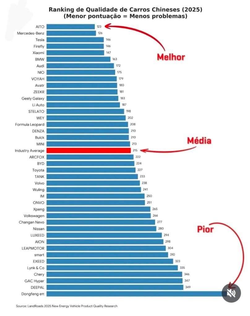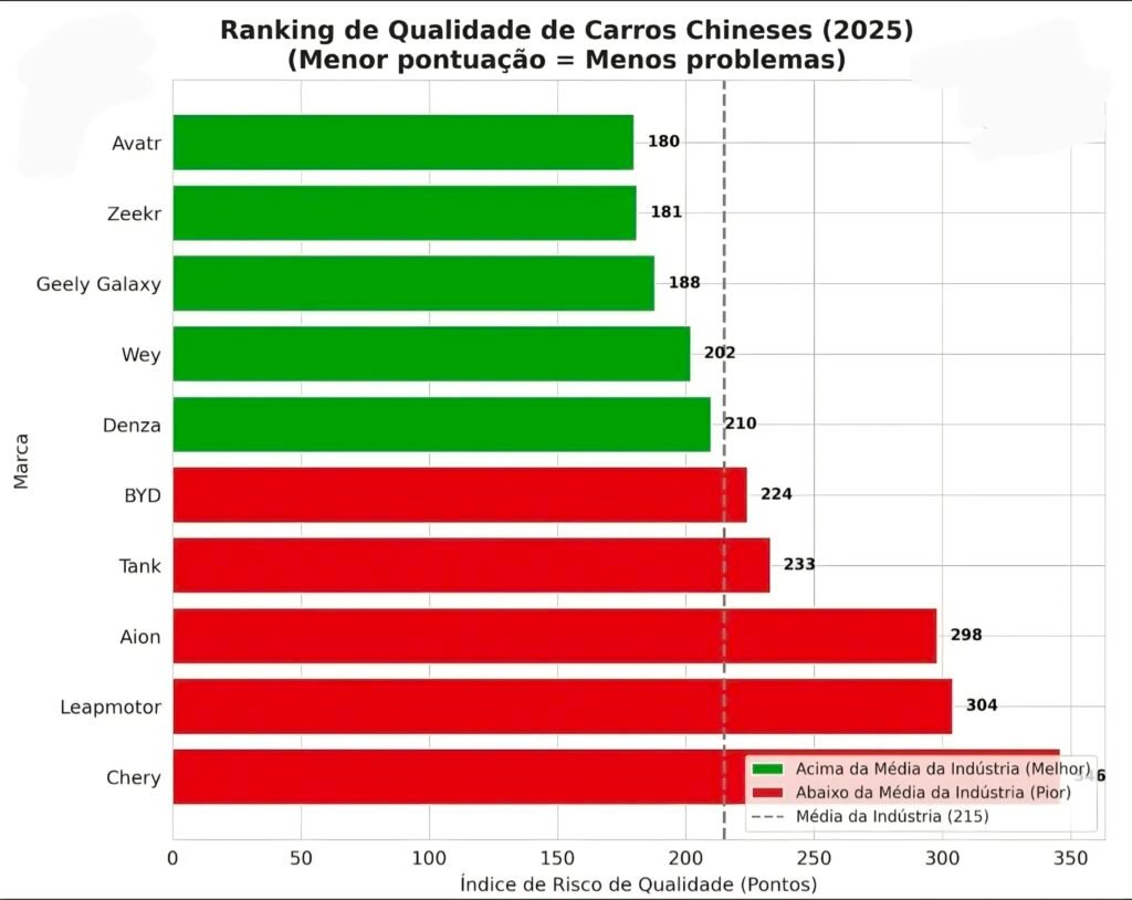 Por outro lado, marcas como BYD, GWM Tank, Aion, Leapmotor e Chery aparecem abaixo da média da indústria chinesa, com índices variando de 224 a mais de 340 pontos. Esse dado é importante porque a percepção externa costuma tratar “o carro chinês” como um bloco homogêneo, quando na prática há uma dispersão de qualidade tão grande quanto a observada entre marcas europeias, japonesas e americanas (LandRoads, 2025).